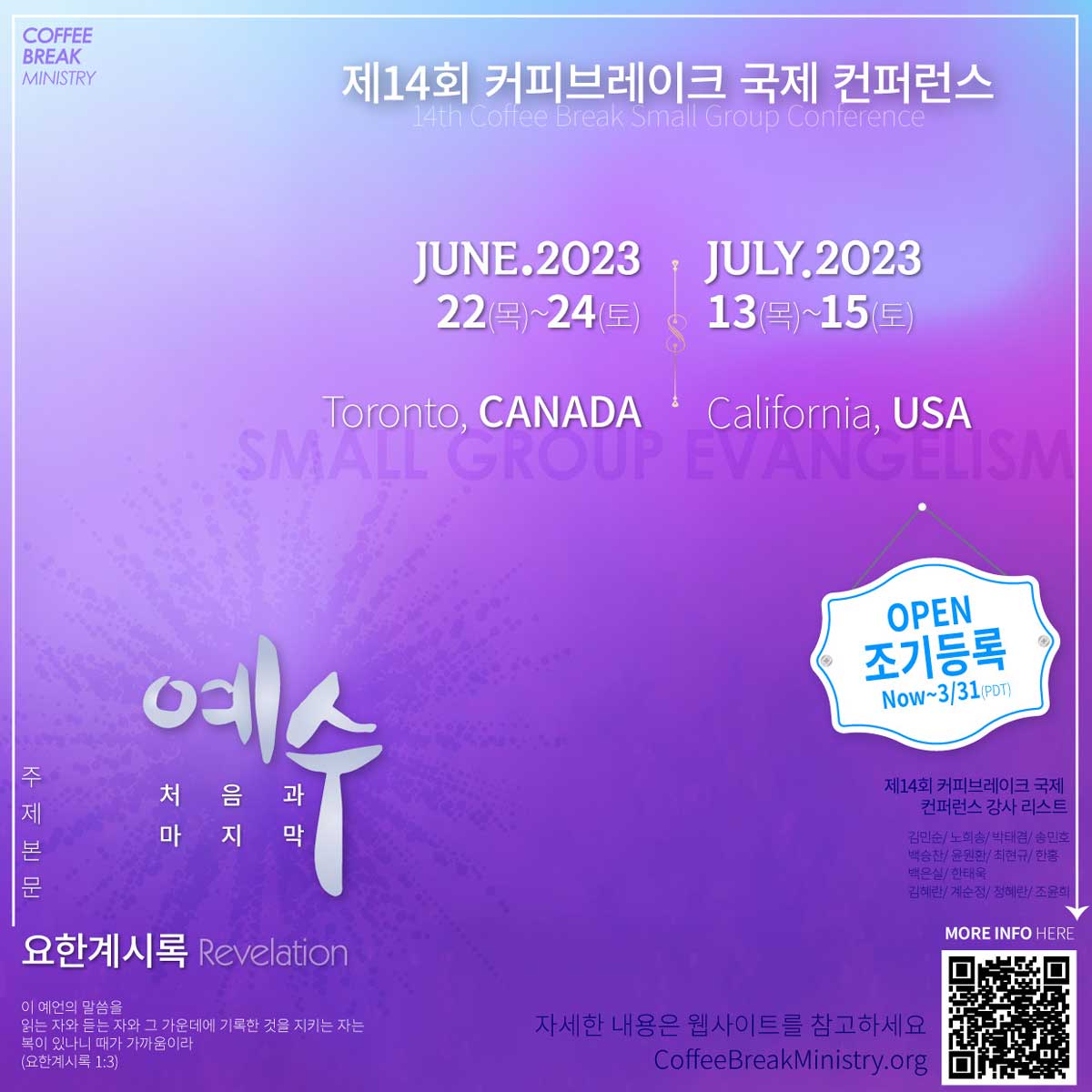말씀을 보고 묵상하는 방법, 소그룹 인도의 실제적인 방법과 소그룹 모임 참여도 포함되어 풍성한 나눔의 자리가 될 것으로 보인다. 컨퍼런스에 관한 자세한 내용은 홈페이지(http://www.coffeebreakkorea.org/contents/conference_global.php)에서 확인할 수 있다. 문의: 조윤희, 14회 컨퍼런스 준비위원장/ Coffee Break Ministry 대표 (unicho2@gmail.com, 661-886-9939), 정혜란, 총무(cjenn3000@gmail.com, 951-444-0150)