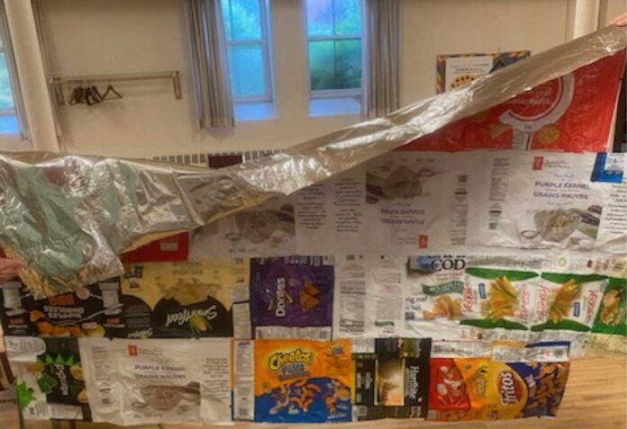 한 지역 교회의 교인들이 감자칩 봉지와 같이 호일로 된 포장지로 담요를 만들어 노숙자들을 도우려고 노력하고 있다.