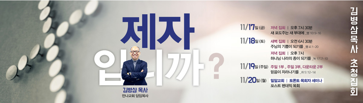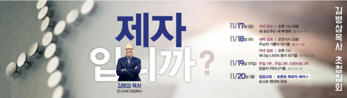 토론토 큰빛교회(담임목사 노희송)가 이번 11월 17(금)-19일(주일)까지 3일간 김병삼 목사(만나교회)를 초청해 부흥회를 개최한다. 탁월한 설교가로 알려진 김병삼 목사님께서 “제자입니까”라는 주제로 영적으로 무기력해져가는 성도들의 삶에 새로운 도전과 은혜를 나눌 예정이다.