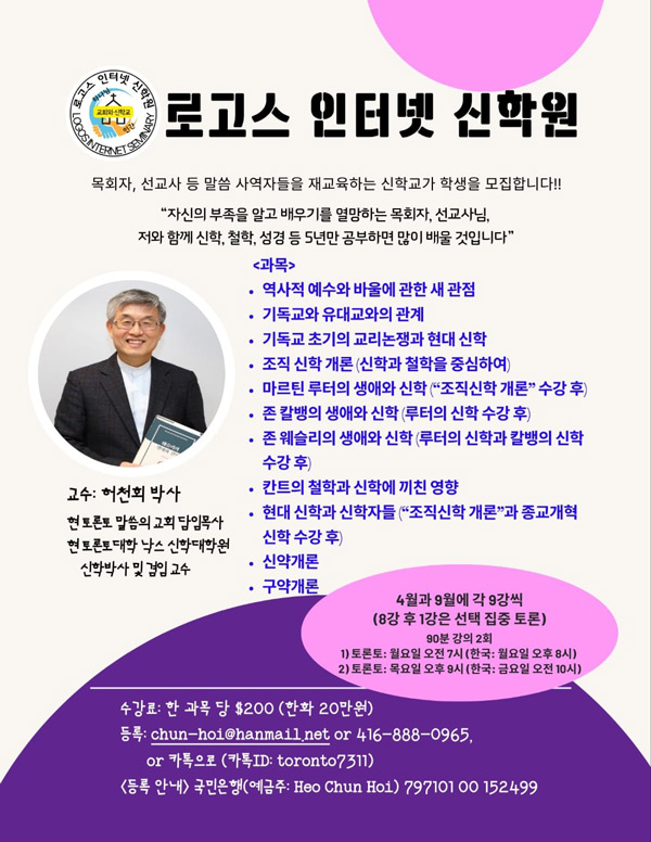 첫날 4월25일(목) 개강은 공개 강좌로 열리며 “신학공부 어떻게 할 것인가? 어떤 책을 읽어야 하는가?” 란 제목으로 진행된다. 정원은 선착순 20명이며 등록비는 $200달러 이다. 강의는 줌으로 들을수도 있으며 강의 내용만 구입할수도 있다.