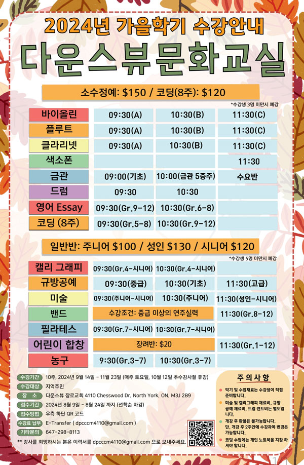 다운스뷰 문화센터(4110 Chesswood Dr. North York) 가을학기가 9/14(토)부터 11/23(토)까지 열린다. 가을학기의 접수 기간은 8/9(금) ~ 8/24(토)이고 포스터에 있는 QR코드를 통해 등록할 수 있다.