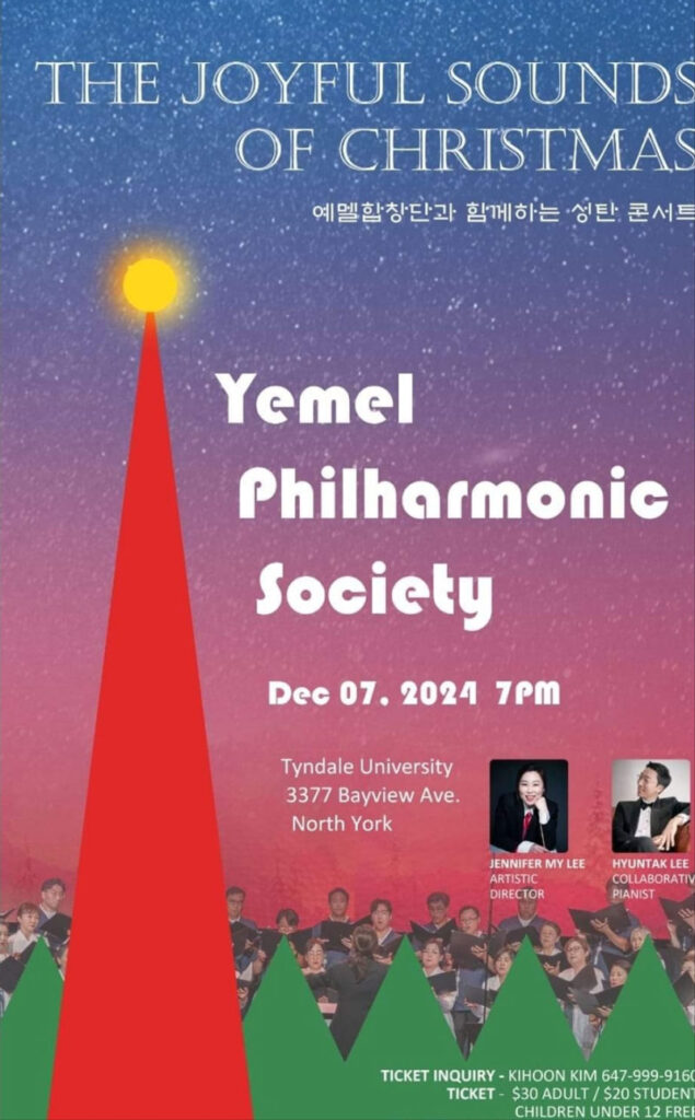 토론토 예멜합창단(단장 김기훈) 성탄콘서트 “The joyful sounds of Christmas “가 오는 12월 7일(토) 저녁 7시에 Tyndale University(3377 Bayview Ave North York)에서 열린다.