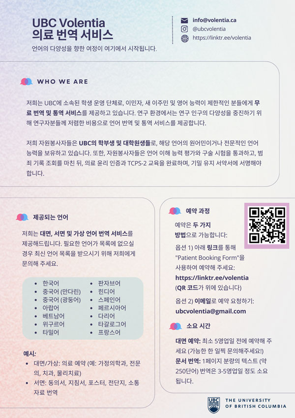 캐나다 한인 여러분, 의료진과의 소통이 어려우셨나요? 영어가 능숙하지 않아 병원 방문이나 건강 상담에서 불편을 겪고 계신가요? 이제 UBC Volentia가 신뢰할 수 있는 번역 서비스를 통해 언어 장벽을 허물어 드립니다.