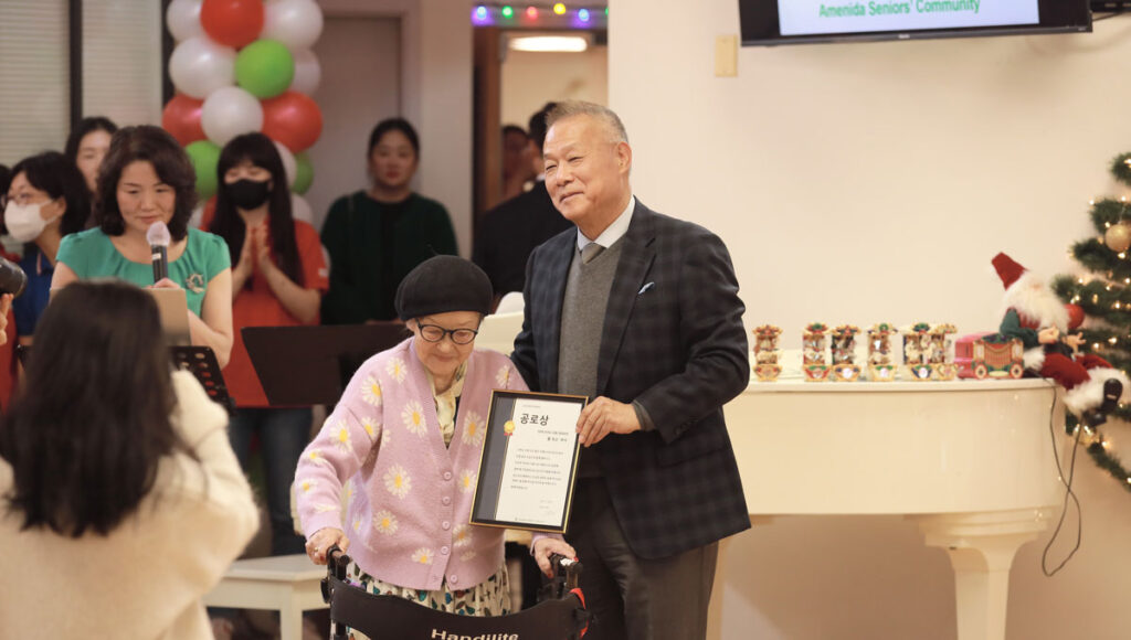 이어 공로상 수여 순서를 가졌다. 아메니다 15주년을 설립때부터 함께한 노갑희 여사(100세), 장연옥 여사(90세), 황옥순 여사(101세) 세 분에게 마음을 담아 공로상을 전달하는 시간을 가졌다. 또한 아메니다 시니어들이 직접 모금한 헌금을 시온선교합창단에 전달하는 시간도 함께 진행했다.