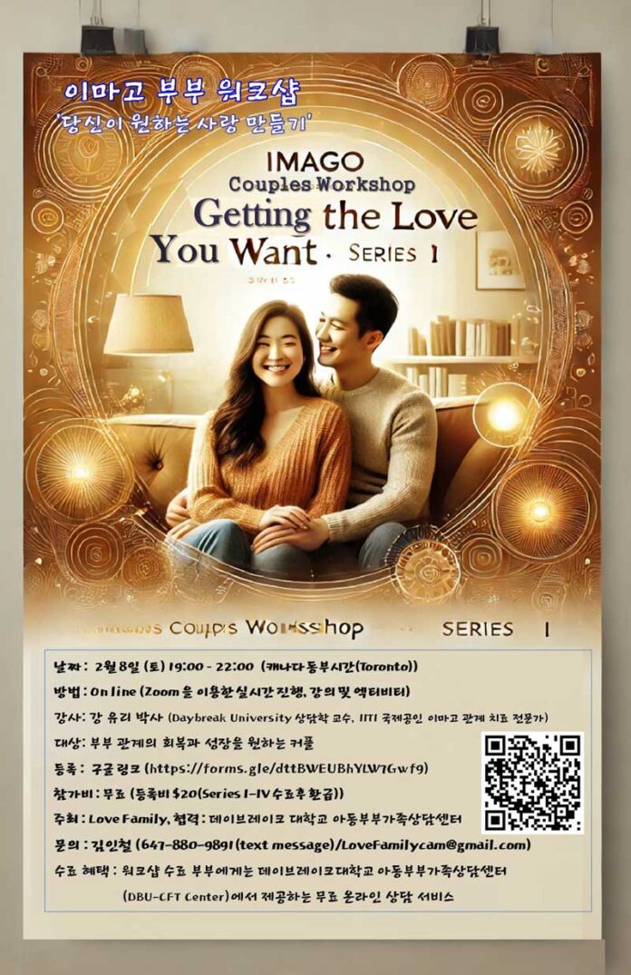 Imago Couples Workshop ‘당신이 원하는 사랑 만들기’ Series I은 2월 8일(토) 오후 9 – 10시(토론토 시간), 6-7시(밴쿠버 시간)에 온라인(ZOOM)을통한 실시간 강의와 활동으로 이루어 진다. 이번 세미나 참여 대상으로는 부부관계의 회복과 성장을 원하는 커플은 누구든지 참여가 가능하며 무료입니다.
