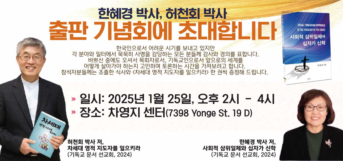 허천회, 한혜경 목사 부부의 출판 기념회가 오는 25일(토) 오후 2시 차영지 센터(7398 Yonge St. 19 D Thornhill)에서 열린다. 이번 출판 기념회 저서는 허천회 목사의 [차세대 영적 지도자를 일으키라, 서울기독교문서선교회,2024], 한혜경 목사 [사회적 삼위일체와 십자가 신학, 기독교문서선교회 2024]이다.