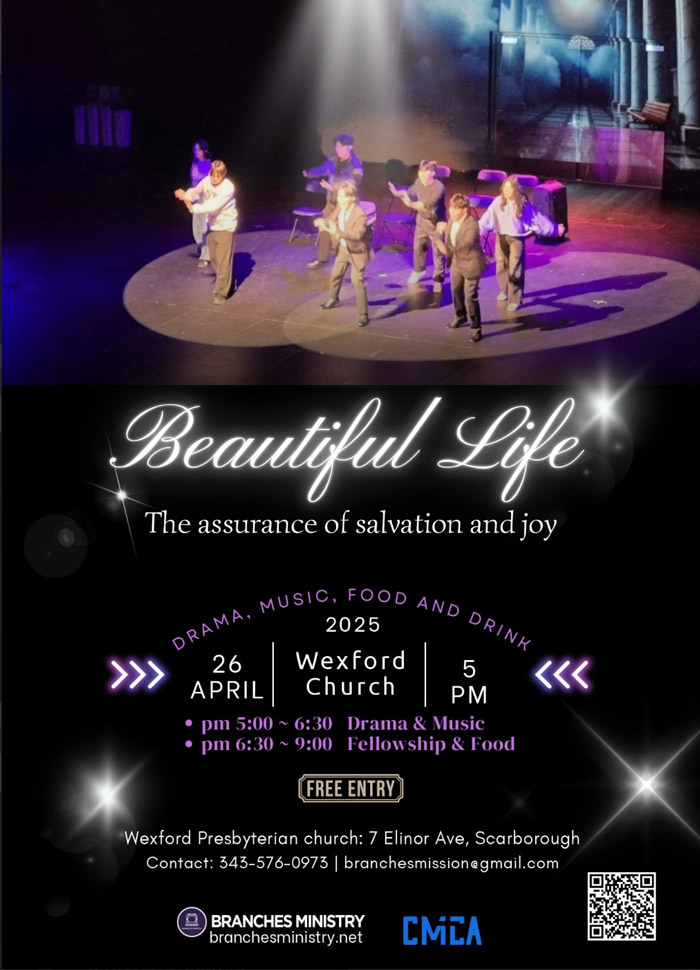 극단 브랜치스 미니스트리(대표 김태현)와 CMCA(Canada Mosaic Christian Alliance: 임재량 선교사) 및 센테니얼 칼리지 사역팀이 공동주최하는 크리스천 콘서트 ‘Beautiful Life’가 오는 26일(토) 오후 5시부터 스카보로의 Wexford Church에서 무료행사로 열린다.