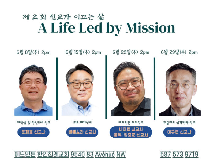 에드먼튼 한인침례교회(권성범 목사)는 오는 6월 8일(주일)부터 29일(주일)까지 매주 주일 오후 2 시, 제 2 회 “선교가 이끄는 삶(Life Led by Mission)”의 주제로 선교 집회를 교회 본당(9540 – 83 Avenue NW)에서 개최한다.