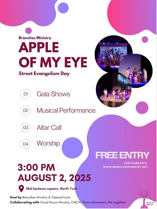 오는 2025년 8월 2일(토) 오후 3시, 토론토 노스욕 중심 Mel Lastman Square에서 Branches Ministry가 주최하는 거리 복음집회 **‘APPLE OF MY EYE Street Evangelism Day’**가 열린다. 이번 집회는 지역 교회와 여러 사역 단체가 함께 연합하여, 도심 한복판에 복음의 기쁨과 소망을 전하는 자리로 마련됐다.