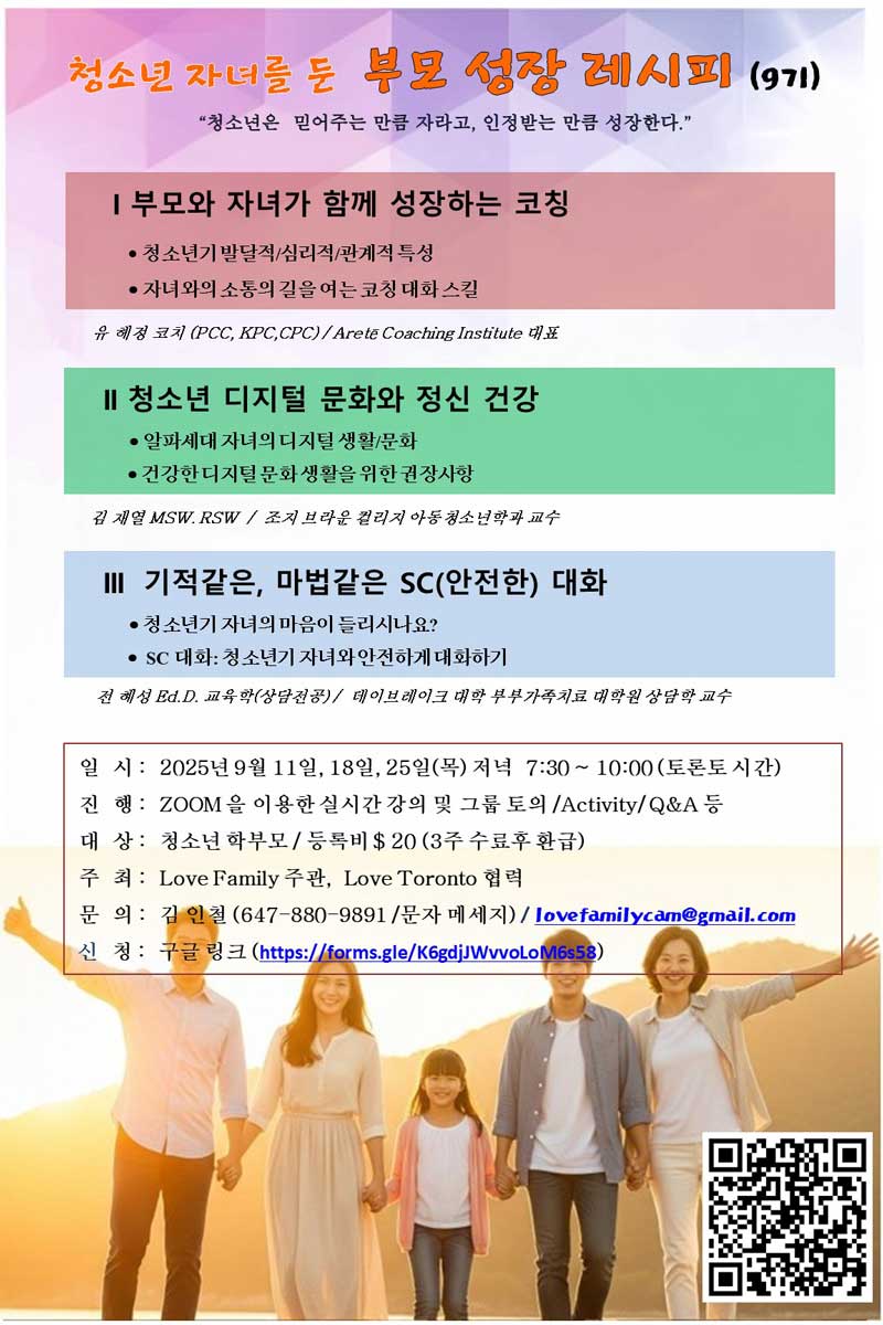 청소년 자녀를 둔 한인 부모들을 위한 특별한 온라인 부모교육 프로그램 Love Family ‘부모 성장 레시피’ 제9기가 오는 9월 11일(목)부터 3주간 개최된다.