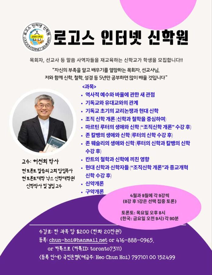 강의를 진행한 허천회 교수는 토론토대학교 낙스신학대학원(Knox College) 겸임교수로 조직신학을 강의하고 있다. 서울신학대학교와 장로회신학대학교 신학대학원을 거쳐 캐나다로 유학, 토론토대학교 낙스신학대학원에서 신학석사(Th.M.)와 신학박사(Th.D.) 학위를 취득한 허 목사는 루터, 칼빈, 웨슬리 신학은 물론 20세기 신학거장 폴 틸리히 연구로도 널리 알려져 있다.
