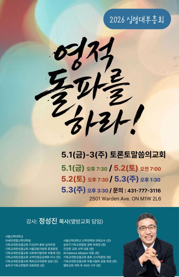 토론토말씀의교회(허천회 목사)가 오는 5월 1일(금)부터 3일(주일)까지 3일간 ‘2026 성령대부흥회’를 개최한다. ‘영적 돌파를 하라!’는 주제로 정성진 목사(열방교회)를 강사로 초청하여 성도들의 신앙 회복과 영적 각성을 촉구하며, 침체된 신앙의 상태를 넘어 새로운 믿음의 단계로 나아가도록 도전하는 데 목적을 두고 있다.