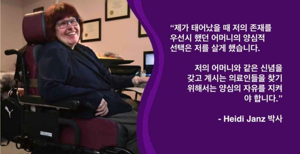 Janz 박사는 그녀가 장애를 가지고도 계속 살아가기를 원한다는 사실에 이해가 가지 않는다는 듯한 반응을 보인 몇몇 의사들과 간호사들과의 비인간적인 경험을 공유했습니다. 의료 전문가들에게 양심의 자유가 보장된다면 Janz 박사와 다른 사람들이 신뢰할 수 있는 의사를 더욱 더 수월하게 찾을 수 있을 것입니다.