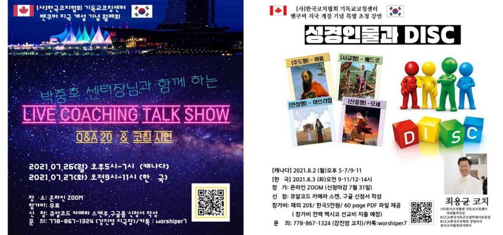 지난 6월13일, 21일 크리스천 코칭 특강을 시작으로, (사)한국코치협회 기독교코칭센터 해외지국인 밴쿠버 지국 개설 기념으로 오는 26일(월) 정기 월례회로 한국코치협회 기독교코칭센터 센터장 박중호 목사를 초청하여 ‘Live coaching talk show’를 진행한다. 이어 밴쿠버 지국 특별 초청 특강으로 8월2일(월) 성경인물과 DISC 세미나(강사 최용균 코치) 진행될 예정이다.