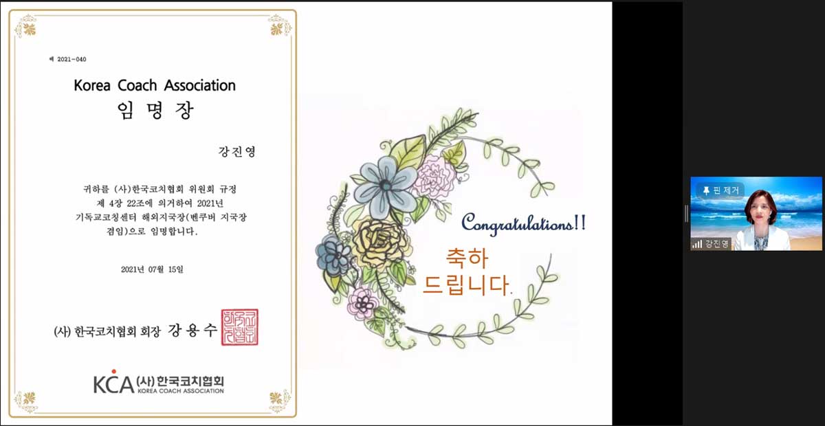 사단법인 한국코치협회 기독교코칭센터 해외지국 지국장 임명이 15일(목) 온라인(ZOOM)으로 진행되었다. 이번에 밴쿠버 지국 지국장으로 임명된 강지영 코치(trinity hug coaching center 대표)는 제4회 한국코치협회 기독교 코칭센터의 중요 행사인 <콜로키움>행사에서 임명식이 진행되었다. 한국코치협회에서 첫 해외지국이 밴쿠버에 설립되어 의미가 더해져 기독교코칭센터측에서도 많은 관심과 격려를 보냈다.
