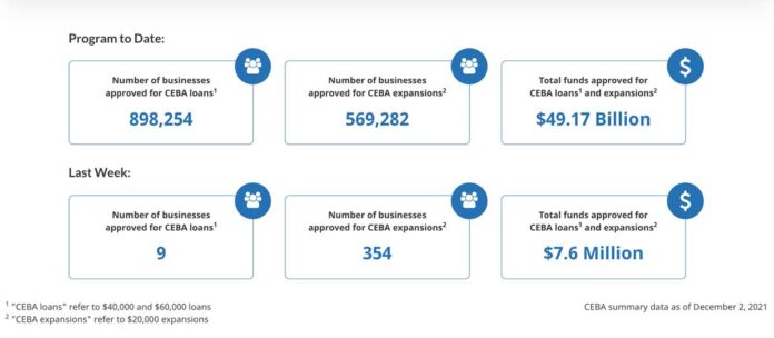 지난해 898,254 기업이 CEBA 대출에 승인되었으며, 총 491억 7000만 달러의 연방 지원금이 제공되었다.