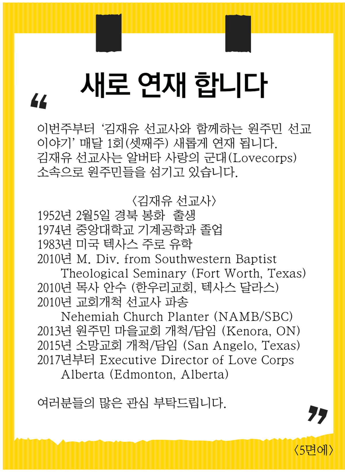 Home교계뉴스캐나다 김재유 선교사와 함께하는 원주민 이야기 [연재시작] 김재유 선교사와 함께하는 원주민 이야기 By admin 1월 21, 2022 김재유 선교사와 함께하는 원주민 이야기 FacebookXWhatsAppEmailNaver Previous article밴쿠버지역한인기독교회협의회 제42차 온라인 정기총회 개최. 회장 이은진 목사, 부회장 김시동 목사 선출Next article신학은 하나님을 드러내며 사는 것 최신 뉴스 밴쿠버한인목사회 정기모임 가져 4월 24, 2026 토론토 밀알교회, ‘소저너(Sojourner, 나그네)’ 주제 원데이 부흥회 개최 4월 24, 2026 제 40차 북미주개혁교회 한인목회자협의회 총회&컨퍼런스 개최 4월 24, 2026 밴쿠버지구촌교회 안수집사, 권사 임직예배 및 임직식 4월 24, 2026 Load more 인기 뉴스 크리스천신문 홈페이지 새롭게 단장 했습니다 4월 2, 2021 토론토 밀알교회 노승환 목사 내려놓다 7월 29, 2021 지역사회를 섬김니다 7월 29, 2021 서부캐나다기독단체협의회 양승훈 교수 환송회 개최 7월 29, 2021 Load more