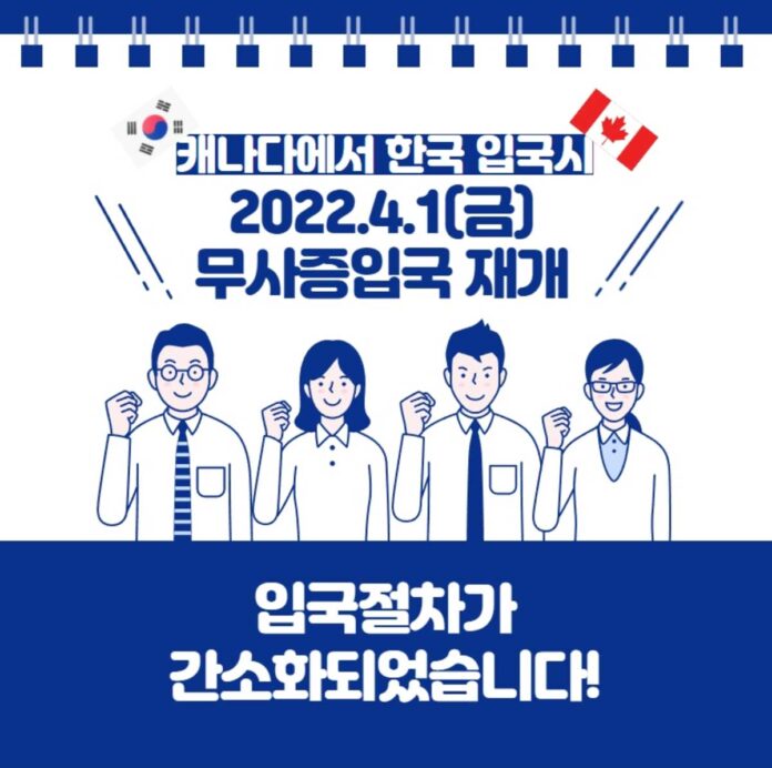 코로나19로 인해 시행 중이던 무사증입국 잠정 중단 조치가 일부 국가를 대상으로 해제됨에 따라 캐나다에서 대한민국 입국 시 무사증 입국이 가능해졌다. 2020년 4월 13일 한국 정부가 사증면제협정 및 무사증입국 잠정 정지 조치를 실행하며 한국을 방문하고자 하는 캐나다 국적자는 반드시 비자를 발급 받아야 했었다. 지난 21일 발표에 따라서 오는 4월 1일 0시 (한국 시간) 부터는 다시 기존처럼 별도의 비자 발급 절차 없이 한국 방문이 가능하다.