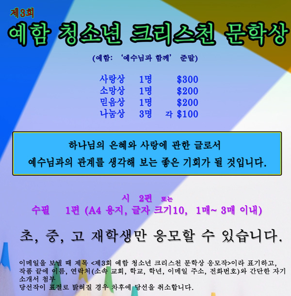 제3회 예함 청소년 크리스천 문학상(김줄리아헤븐 위원장) 당선작이 발표되었다. 예함 청소년 크리스천 문학상의 취지는 하나님의 은혜와 사랑에 관한 글로서 예수님과의 관계를 생각해 보는 좋은 시간과 기회를 갖고자 마련한 상이다. 그것에 심사의 기준을 두고 수상작을 선정하기 때문에 중심이신 하나님이 글 속에서 전혀 찾아볼 수 없는 시나 수필은 입상의 조건에 맞지 않아 배제된다.