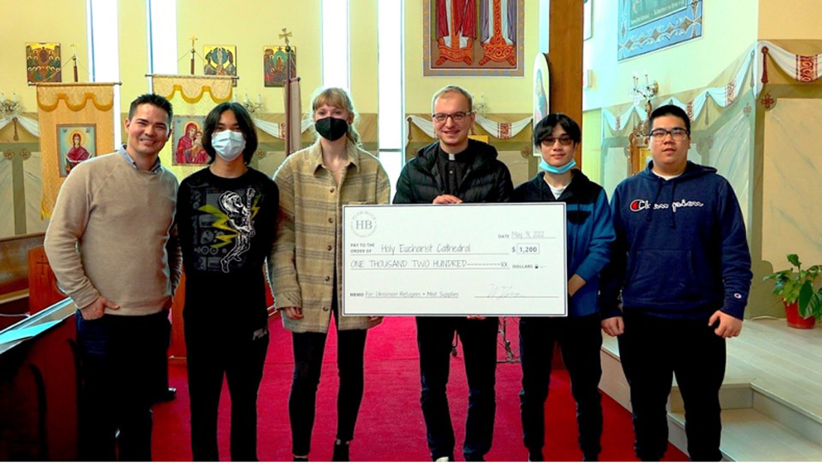 B.C주 리치몬드(Richmond)의 리치몬드의 보이드 세컨더리(Boyd Secondary) 12학년 학생들이 우크라이나인들을 돕기 위한 기금을 가톨릭 교회(Holy Eucharist Ukrainian Catholic Cathedral)에 전달했다.