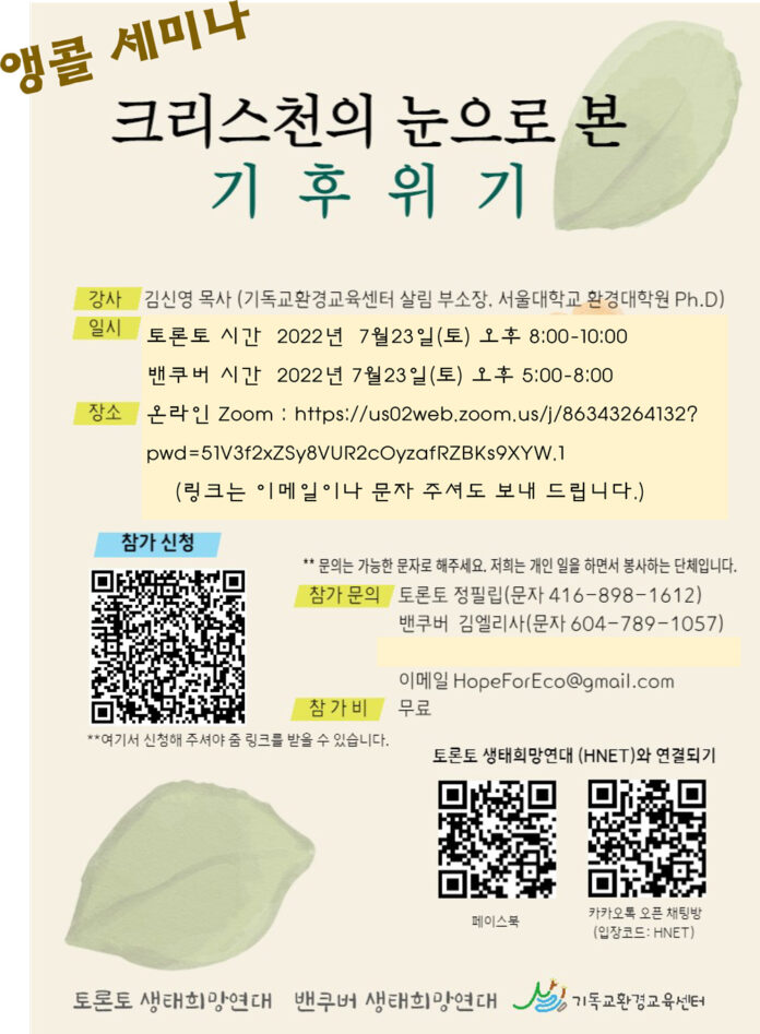 이번 세미나는 벤쿠버 시간 오후 5-8시에 진행되며, 요즘 유럽의 푹음과 대형산불, 가뭄의 원인도 모두 기후위기에서 오는 것이기에 경각심을 갖고 삶에 보템이 되는 유익한 시간이 될 것이다.