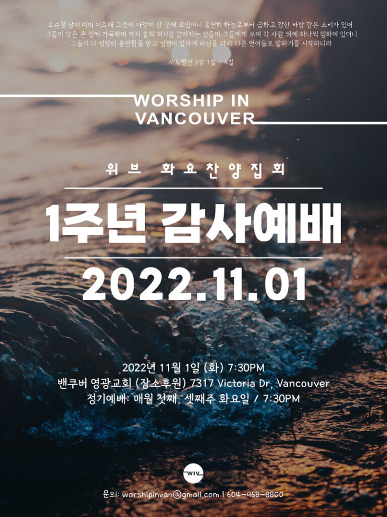 WIV는 Worship in Vancouver의 의미를 가지고 있는 위브 화요찬양집회는 리더 오성훈 목사를 중심으로 다양한 교회에 소속된 팀원들로 구성된 밴쿠버 연합 워십팀이다. 하나님을 향한 진정한 찬양과 예배를 꿈꾸고 밴쿠버 땅의 영적 회복을 위하여 뜨겁게 기도하는 찬양 예배 입니다.