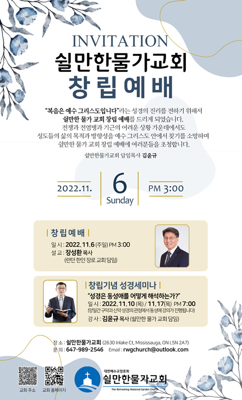 쉴만한물가교회(담임 김윤규 목사)는 오는 6일(주일) 창립 예배를 드린다. 쉴만한물가교회는 지난해 11월 첫주에 김윤구 목사가 가정에서 첫 예배를 드리기 시작하였으며, 12월부터 Meadowvale Christian Reformed Church(2630 Inlake Crt. Mississauga)에서 예배를 드리고 있다. 이번 창립예배는 런던한인장로교회를 담임하는 장성환 목사가 설교를 전한다.