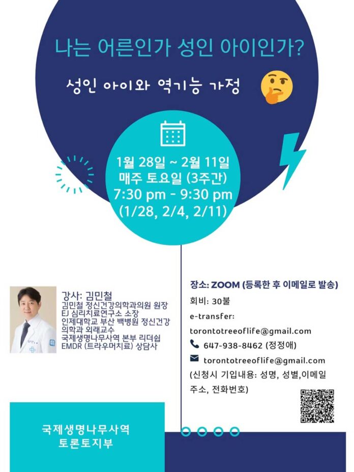 국제생명나무 사역 토론토 지부에서 김민철 강사(정신건강의학과의원)를 모시고 ‘나는 어른인가 성인아이 인가?’ 라는 제목으로 세미나를 개최한다.
