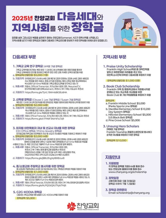 미국 동부 뉴저지에 위치한 찬양교회(노승환 목사)가 담장을 넘어 그리스도의 복음을 실천하기 위해 장학사역을 시작한다. 지역사회를 섬기기 위한 장학금과 더불어 다음세대 기독교리더를 양성하기 위한 장학생을 선발한다. 장학금은 1) 다음세대 5개 부분 2) 지역사회 3개 부분으로 총 8개 부분으로 장학생을 선발한다. 아래의 장학생 선발 기준을 참고하여 장학금 신청을 하면 된다.