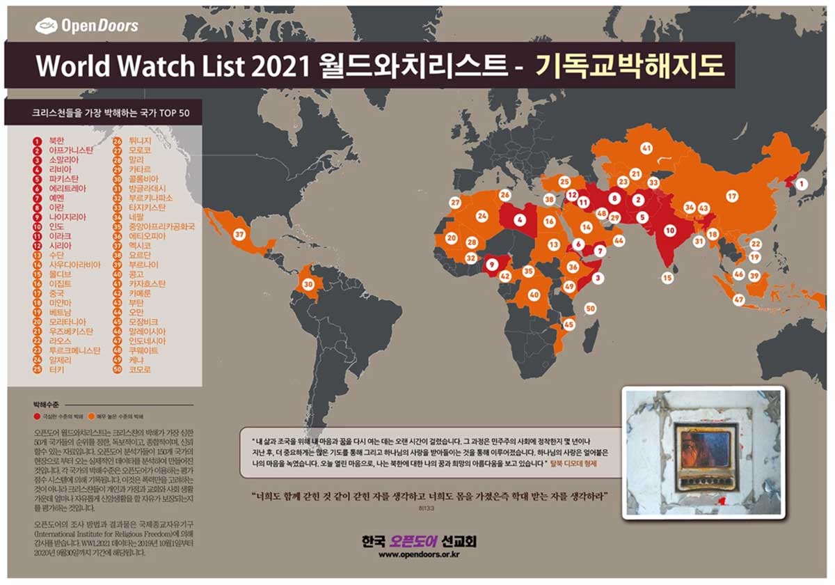 북한은 지난 20년 동안 세계 감시 목록 1위(또는 그 근처)를 기록했으나 올해는 아프가니스탄에 빼앗겼다. 그러나 이것은 분명히 말해 북한 기독교인들의 상황이 개선되고 있다는 의미가 아닌, 아프가니스탄의 상황이 더 나빠졌다는 의미다.