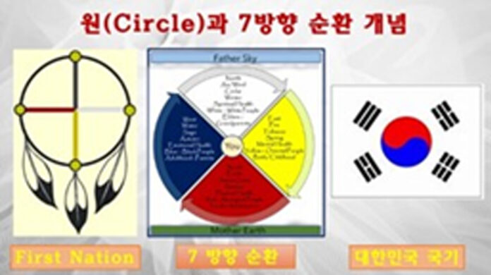 저는 원주민 사상의 근본을 구성하고 있는 4방향과 7방향의 사상이, 우리 태극기의 4괘의 건(3), 곤(6), 감(5), 리(4)와 태극과 참 많이 닮았다는 생각을 하게 됩니다. 4괘 역시 하늘, 땅, 물, 불을 상징하고, 봄, 여름, 가을, 겨울을 상징하며, 동, 서, 북, 남을 상징하며, 인, 의, 지, 예와 부, 모, 남, 여를 상징합니다. 그리고 태극으로 하늘과 땅이 어우러져서 조화를 이루는 것 까지를 고려해 보면, 원주민과 우리 한국 사람이, 조상과 뿌리가 같다는 추측을 더 하게 되는지도 모르겠습니다.