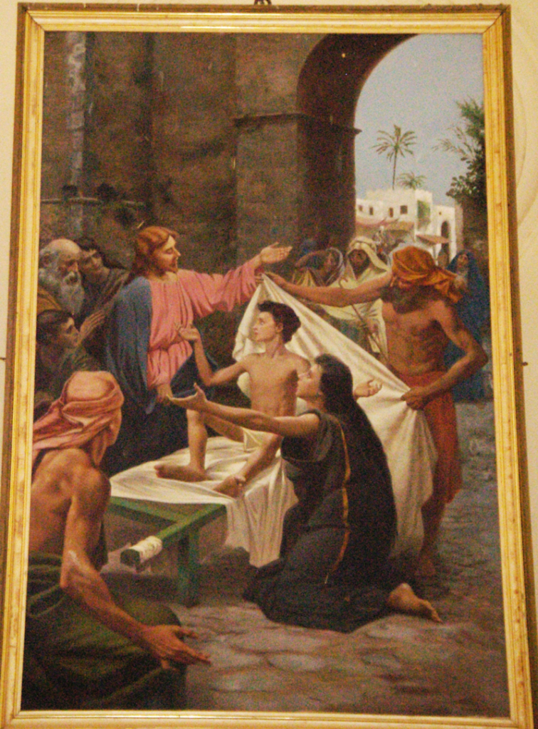 에게리아의 기록과 같이 어느 날 예수님께서 갈릴리의 나인이란 성으로 가까이 가셨을 때, 한 무리의 사람들과 조우하게 되는데, 그것은 그 마을 어느 과부의 하나밖에 없는 아들의 장례 행렬이었다. 이스라엘 사회에서 가장 불쌍한 사람 세 부류가 있었는데 그들은 고아, 나그네 그리고 과부였다 (신 10:18). 남성 위주의 사회였던 고대 이스라엘에서 아들도 죽어버린 과부는 그 사회에서 마지막 보호장치가 사라져버린 무방비 상태가 된 것이다. 즉 나인성 과부는 불쌍한 자들 중에 더욱 불쌍한 자가 되었던 것이다. 그 과부의 아들이 담긴 관은 나인성 성문 밖에 장사될 예정이었던 것 같다. 이때 아마도 갈릴리 가버나움에서 약 8시간 이상을 걸어 이곳에 오신 예수님께서는 성문을 통과해 묘지로 향하는 과부를 보시고 불쌍히 여기셔서 울지 말라 하시고 그 관에 손을 대시고 말씀하셨다.