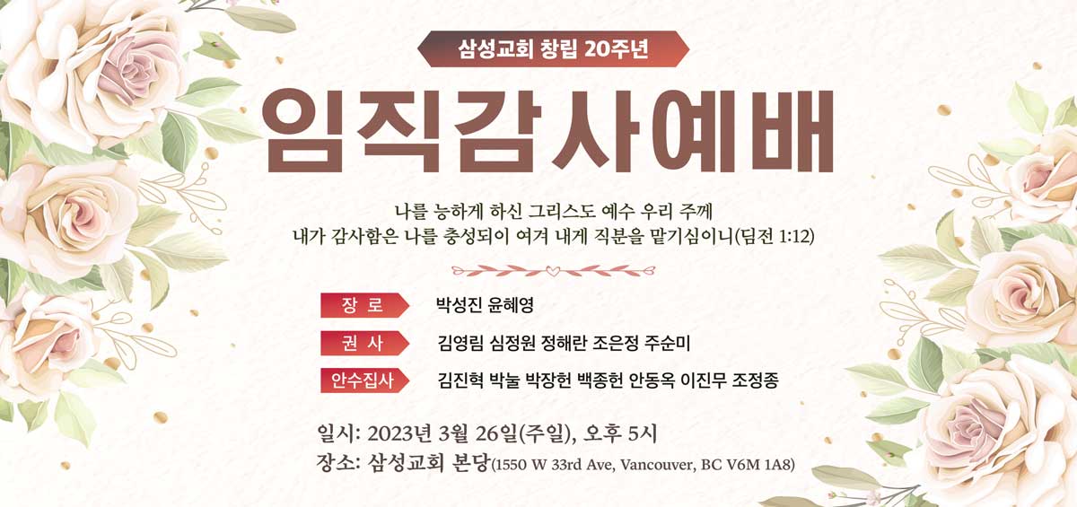 [임직예배] 밴쿠버 삼성교회 창립 20주년 임직감사예배 안내