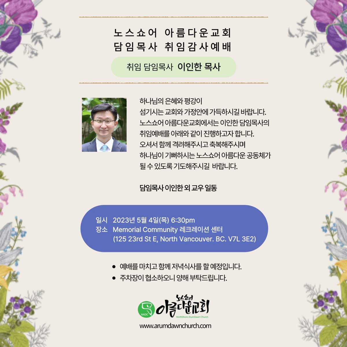 [위임식안내] 밴쿠버 영광교회 교회 합병 및 제7대 윤성은 담임목사 위임식