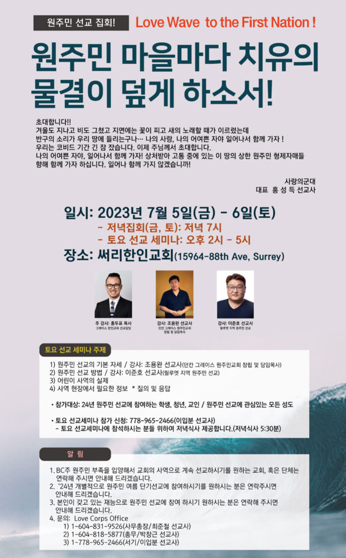 행사안내 [원주민 선교집회] 사랑의 군대 주관 ‘Love Wave to the First Nation!’ 5월 10, 2024 [원주민 선교집회] 사랑의 군대 주관 ‘Love Wave to the First Nation!’