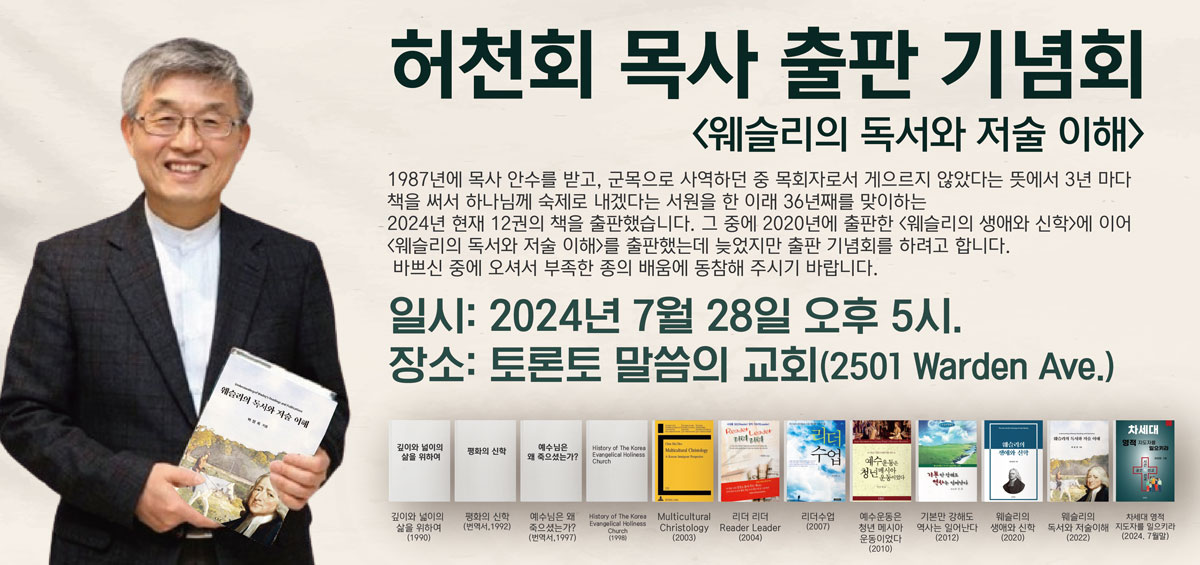 행사안내 [출판기념회] 토론토 말씀의 교회 허천회 목사 출판 기념회 <웨슬리의 독서와 저술 이해> 7월 19, 2024 [출판기념회] 토론토 말씀의 교회 허천회 목사 출판 기념회 <웨슬리의 독서와 저술 이해>
