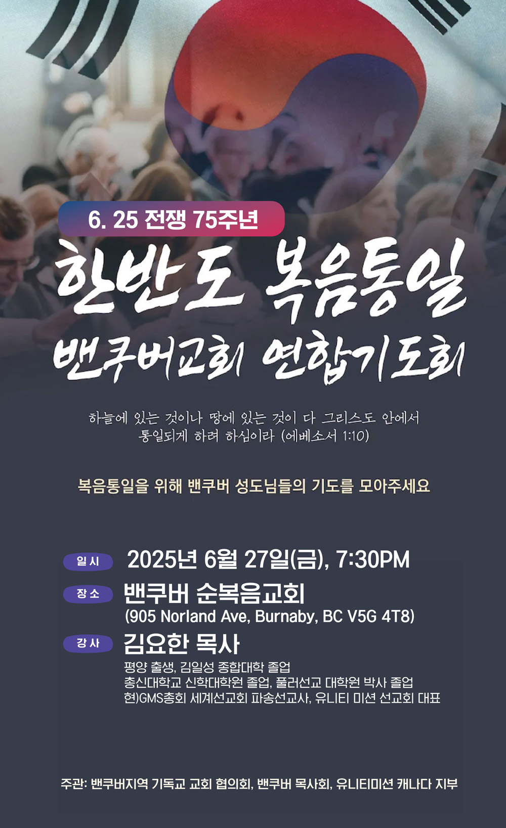 6.25 전쟁 75주년, 한반도 복음통일 밴쿠버교회 연합 기도회 안내