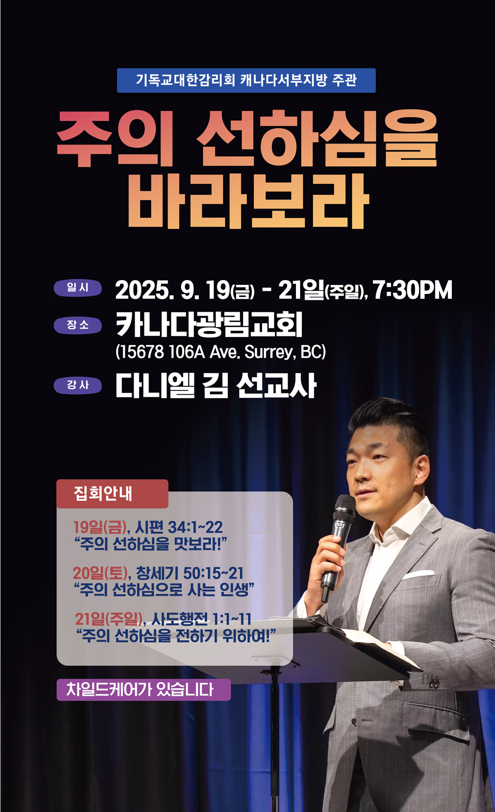 행사안내 [연합성회] 기독교대한감리회 캐나다 서부지방회_다니엘 김 선교사 초청 연합성회 8월 29, 2025 [연합성회] 기독교대한감리회 캐나다 서부지방회_다니엘 김 선교사 초청 연합성회