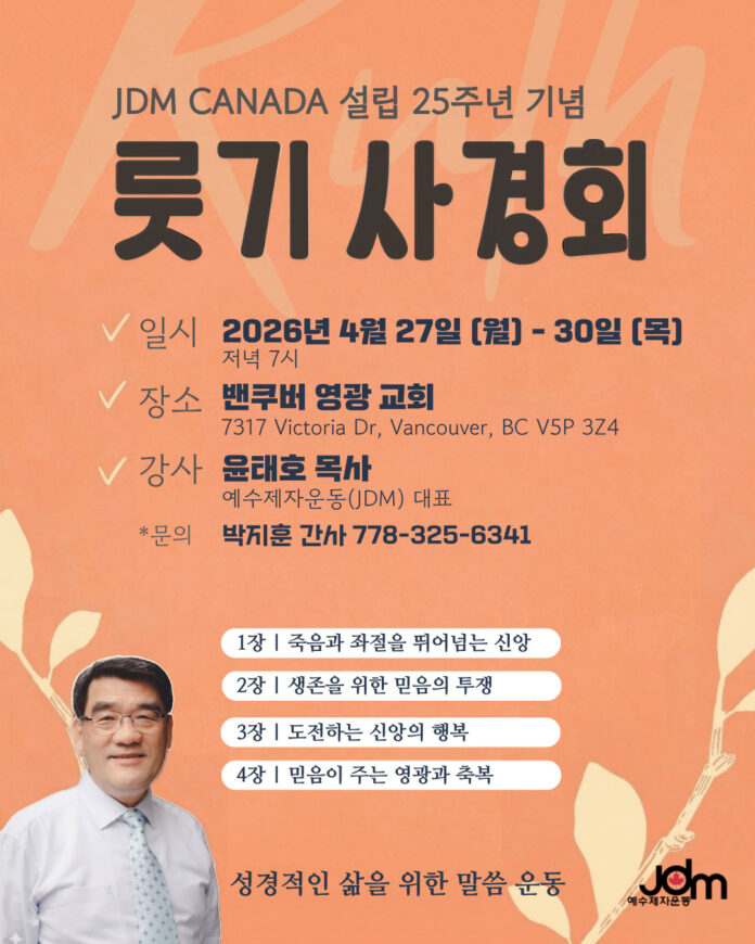 행사안내 [사경회] JDM CANADA 설립 25주년 기념 윤태호 목사 초청 ‘룻기 사경회’ 4월 3, 2026 [사경회] JDM CANADA 설립 25주년 기념 윤태호 목사 초청 ‘룻기 사경회’