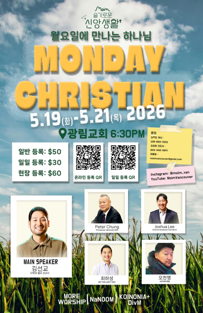 행사안내 [컨퍼런스] Moim Vancouver ‘슬기로운 신앙생활’ 컨퍼런스 등록 안내 4월 10, 2026 [컨퍼런스] Moim Vancouver ‘슬기로운 신앙생활’ 컨퍼런스 등록 안내
