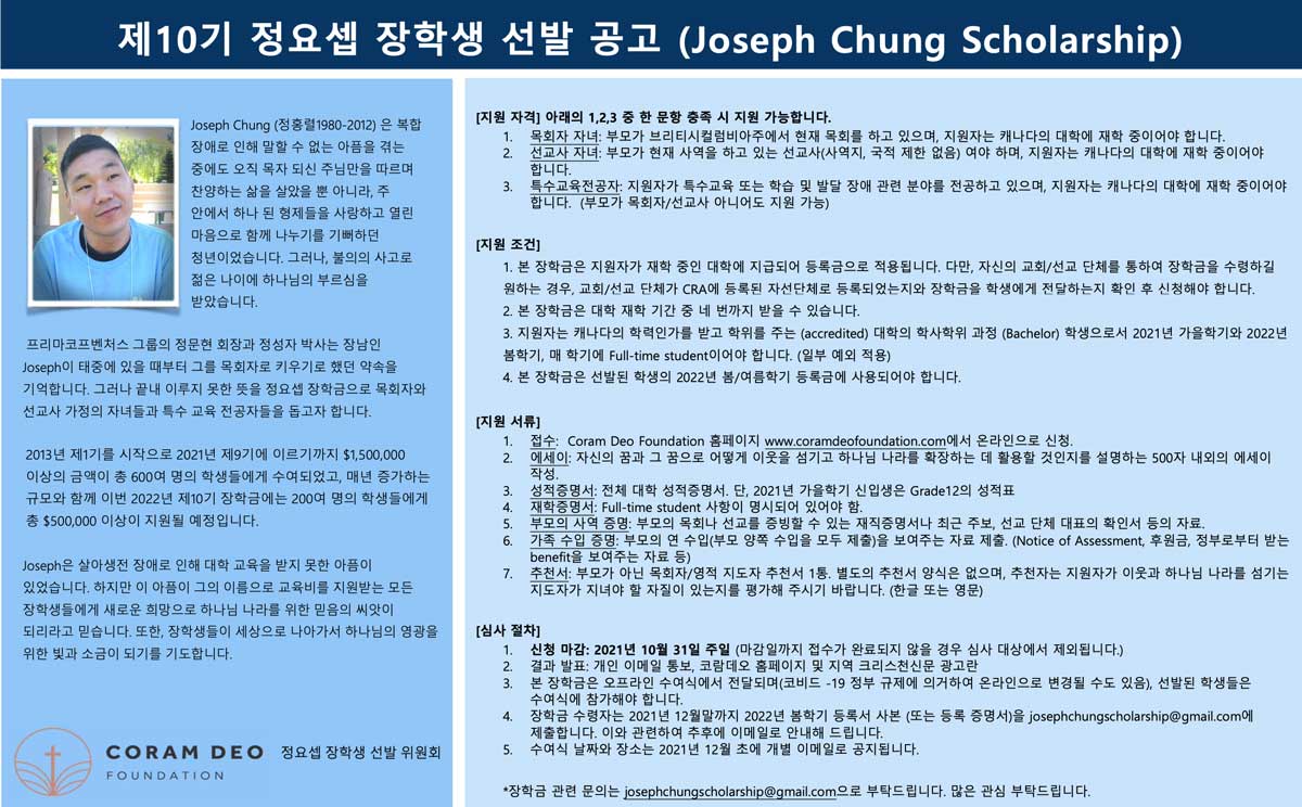 Home행사안내제10기 조셉정 장학금 선발 공고 제10기 조셉정 장학금 선발 공고 By admin 9월 24, 2021 제10기 조셉정 장학금 선발 공고 FacebookXWhatsAppEmailNaver Previous article시냇가은혜예배 창립 감사 예배 안내Next article[목회자컨퍼런스] 온라인 목회자 컨퍼런스 안내 Advertisment - Advertisment - 최신 행사 [KOSTA] 밴쿠버 청년 코스타 등록 안내 4월 24, 2026 [목회자 교육] 미주 성결교회 캐나다지방회 목회자 교육 4월 24, 2026 [아메니다] 아메니다 맞춤형 어시스티드 리빙 소개 4월 24, 2026 [두란노 어머니학교] 523차 미주 두란노 어머니학교 밴쿠버 21기 모집 안내 4월 24, 2026 Load more 인기 행사 [밴쿠버] 밴쿠버중앙장로교회 김현 목사 위임감사예배 안내 2월 16, 2021 [교회이전안내] 밴쿠버만나교회 이전 안내 3월 25, 2022 [캐나다] 기독교역사기초과정(온라인/밴쿠버기독교세계관대학원) 2월 16, 2021 [광고] 이제 밴쿠버에서 한국이불 직접 보시고 구매하세요! 11월 4, 2021 Load more