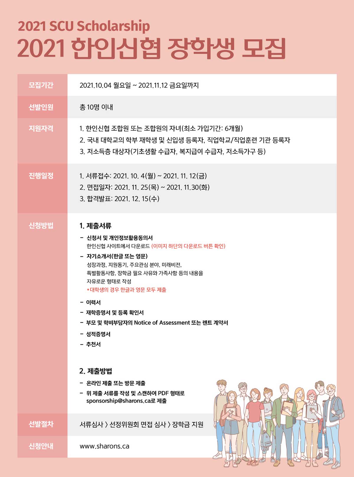 Home행사안내 한인신협 장학생 모집 안내 [장학생모집] 한인신협 장학생 모집 안내 By admin 10월 21, 2021 한인신협 장학생 모집 안내 FacebookXWhatsAppEmailNaver Previous article[코칭워크샵안내] 크리스천코칭 워크샵 안내Next article[창립10주년] 조이풀교회 창립10주년 기념 부흥회 안내 Advertisment - Advertisment - 최신 행사 [KOSTA] 밴쿠버 청년 코스타 등록 안내 4월 24, 2026 [목회자 교육] 미주 성결교회 캐나다지방회 목회자 교육 4월 24, 2026 [아메니다] 아메니다 맞춤형 어시스티드 리빙 소개 4월 24, 2026 [두란노 어머니학교] 523차 미주 두란노 어머니학교 밴쿠버 21기 모집 안내 4월 24, 2026 Load more 인기 행사 [밴쿠버] 밴쿠버중앙장로교회 김현 목사 위임감사예배 안내 2월 16, 2021 [교회이전안내] 밴쿠버만나교회 이전 안내 3월 25, 2022 [캐나다] 기독교역사기초과정(온라인/밴쿠버기독교세계관대학원) 2월 16, 2021 [광고] 이제 밴쿠버에서 한국이불 직접 보시고 구매하세요! 11월 4, 2021 Load more