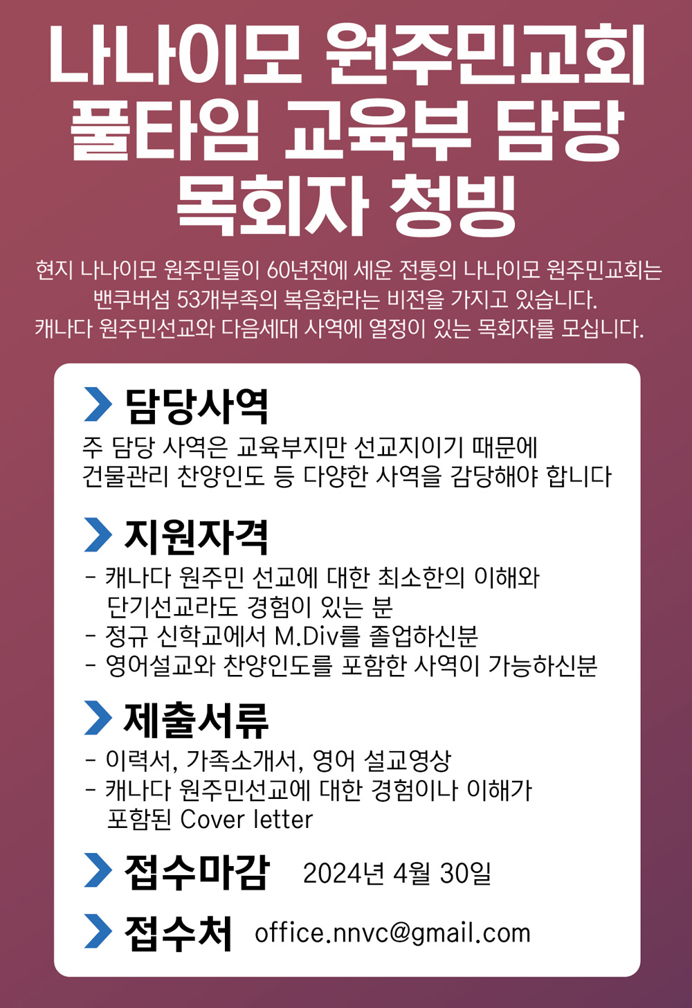 [청빙] 나나이모원주민교회 풀타임 사역자 청빙