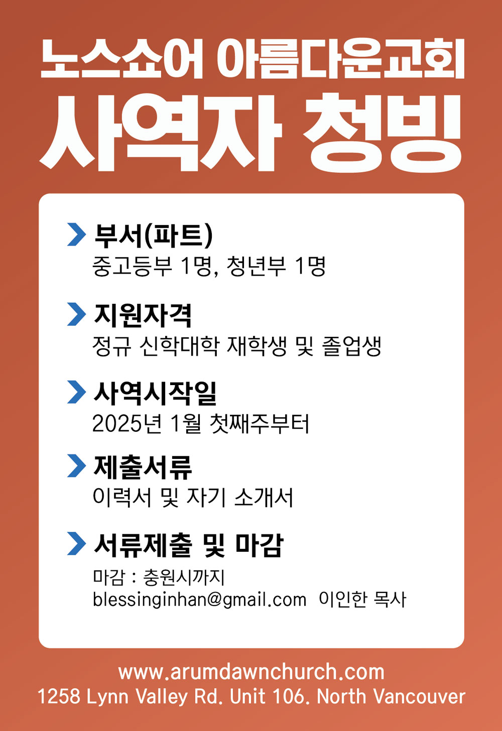 [청빙] 노스쇼어 아름다운교회 사역자 청빙