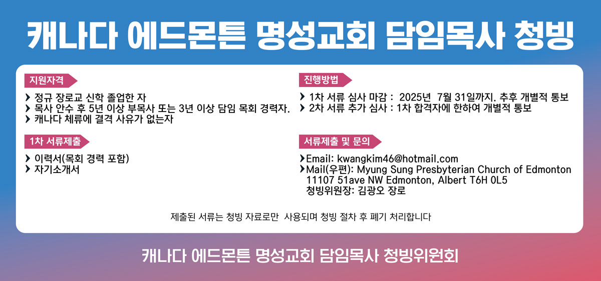 [담임목사청빙] 에드몬튼 명성교회 담임목사 청빙