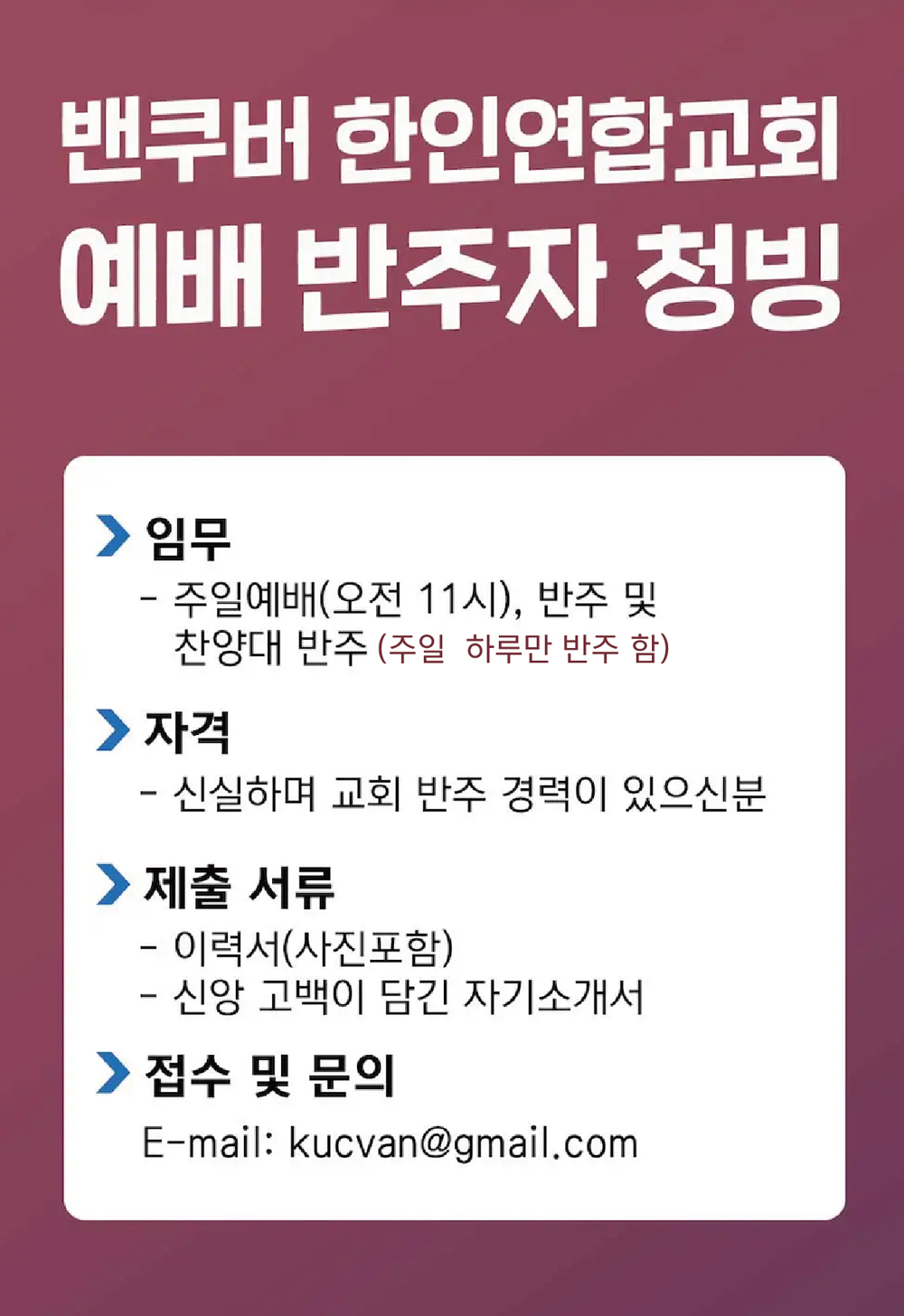 [반주자청빙] 밴쿠버 한인연합교회 반주자 청빙