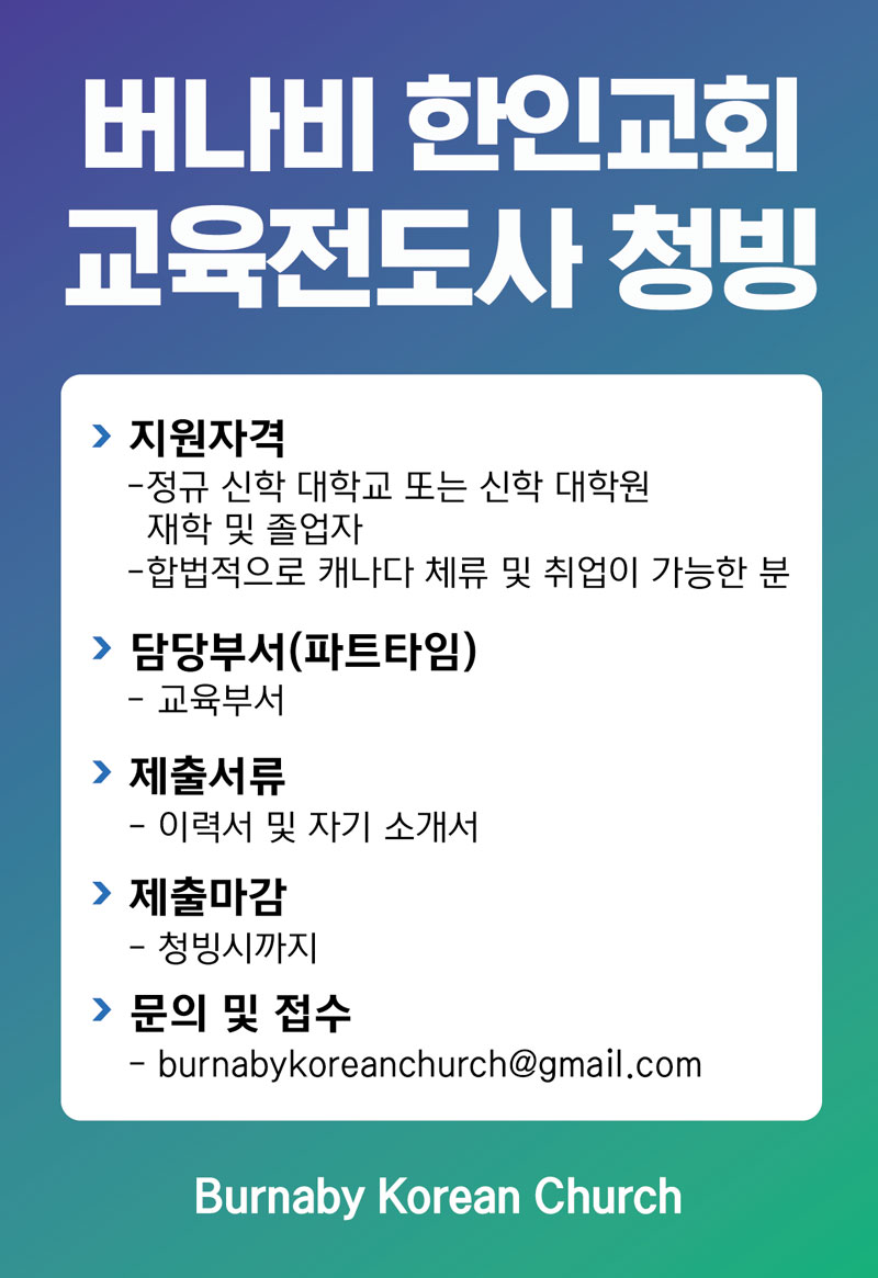[청빙] 버나비한인교회 교육전도사 청빙