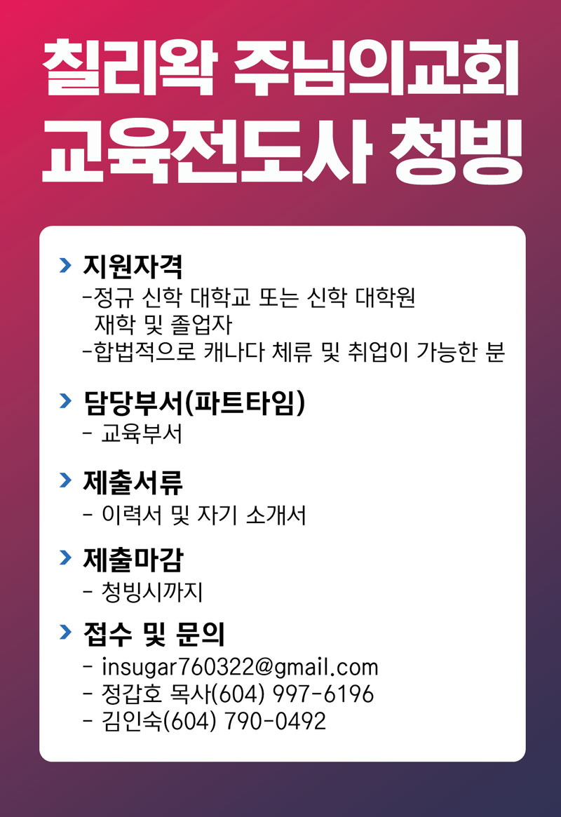 [청빙] 칠리왁 주님의교회 교육전도사 청빙(연장)