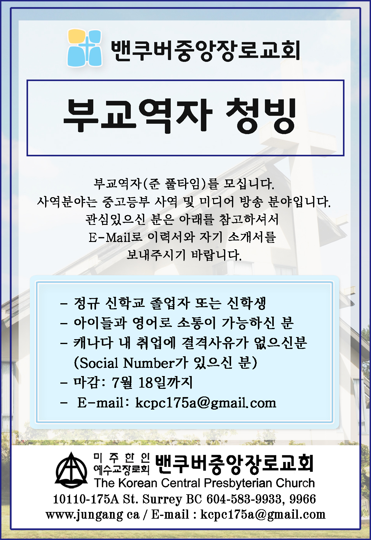 Home청빙 밴쿠버중앙장로교회 중고등부 사역자 청빙_수정 [청빙] 밴쿠버중앙장로교회 중고등부 사역자 청빙_수정 By admin 7월 1, 2021 밴쿠버중앙장로교회 중고등부 사역자 청빙 FacebookXWhatsAppEmailNaver Previous article[청빙] 밴쿠버중앙장로교회 중고등부 사역자 청빙Next article[청빙] 선한청지기교회 교역자 청빙 Advertisment - Advertisment - 최신 청빙 [청빙] 리치먼드 주안에 교회 동역자 청빙 4월 10, 2026 [청빙] 칠리왁 주님의교회 교육전도사 청빙(연장) 3월 20, 2026 [담임목사청빙] 레스브릿지 한인교회 담임목사 청빙 3월 13, 2026 [청빙] 토론토 동산교회 반주자 청빙 3월 13, 2026 Load more 인기 청빙 [청빙] 헤브론교회 교역자 청빙 안내(8/12, 청빙완료) 7월 29, 2021 [청빙] 토론토 큰빛교회 사역자 청빙 안내 11월 4, 2021 [담임목사청빙안내] 밴쿠버한인장로교회 담임목사 청빙 안내 3월 25, 2022 [청빙] 밴쿠버 지구촌교회 청빙 안내 8월 6, 2021 Load more