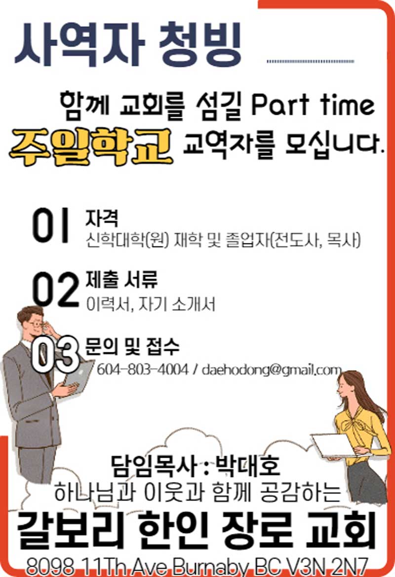 Home청빙갈보리한인장로교회 청빙 안내 [청빙]갈보리한인장로교회 청빙 안내 By admin 9월 17, 2021 [청빙]갈보리한인장로교회 청빙 안내 FacebookXWhatsAppEmailNaver Previous article[청빙] 카나다광림교회 사역자 청빙Next article[청빙] 주님의 제자교회 사역자 청빙안내 Advertisment - Advertisment - 최신 청빙 [청빙] 리치먼드 주안에 교회 동역자 청빙 4월 10, 2026 [청빙] 칠리왁 주님의교회 교육전도사 청빙(연장) 3월 20, 2026 [담임목사청빙] 레스브릿지 한인교회 담임목사 청빙 3월 13, 2026 [청빙] 토론토 동산교회 반주자 청빙 3월 13, 2026 Load more 인기 청빙 [청빙] 헤브론교회 교역자 청빙 안내(8/12, 청빙완료) 7월 29, 2021 [청빙] 토론토 큰빛교회 사역자 청빙 안내 11월 4, 2021 [담임목사청빙안내] 밴쿠버한인장로교회 담임목사 청빙 안내 3월 25, 2022 [청빙] 밴쿠버 지구촌교회 청빙 안내 8월 6, 2021 Load more